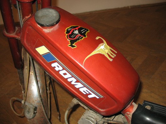 Nalepka przedstawiająca dinozaura w dinozaurze naklejona jest na wystawionym motorowerze obok kultowej naklejki z Wielkimi Węgram, w środku Węgry obecne, taka subtelna analogia zachowywania się jakby się było większym.