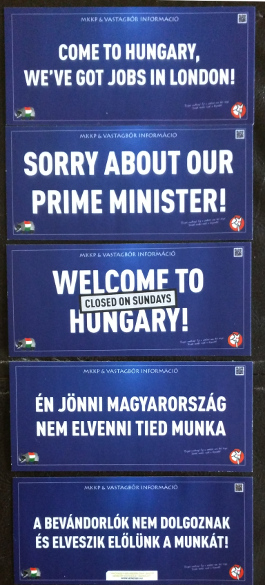 Rządowa kampania antyimigrancka na ulicach widoczna była dzięki billboardom z hasłami “Jeśli przybywasz na Węgry nie możesz odbierać Węgrom pracy”, “Jeśli przybywasz na Węgry musisz szanować naszą kulturę” oraz “Jeśli przybywasz na Węgry musisz szanować nasze prawa”. Warto zauważyć, że wogóle niezwracająca w kontekście polskim uwagi forma “ty” w języku węgierskim nie jest używana w reklamach (w tym i na billboardach), gdzie używa się formy “pan-pani”, na ty mówi się do dzieci – i do cudzoziemców – co w obu przypadkach jest protekcjonalne.