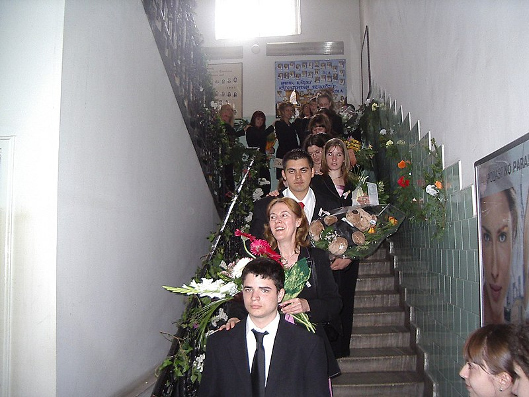 Często klasy zamawiają identyczne garnitury dla chłopaków i analogiczne ubiory dla dziewczyn, rodziny wypruwają się na gigantyczne prezenty, a kwiaciarnie mają jeden z najlepszych dni w roku. Elementem centralnym jest kameralny (tylko uczniowie i nauczyciele) przemarsz przez udekorowaną bzem szkołę a potem procesja na zewnątrz, w mniejszych miejscowościach może to być zamknięta na ten dzień główna ulica. Klasy prowadzą wtedy wychowacy idący pod rękę tradycyjnie z najładniejszymi dziewczynami, wszyscy idą z wielkimi snopami kwiatów jeden za drugim z ręką na ramieniu poprzednika. Przez ramię uczniowie przewieszoną mają małą sakiewkę (tarisznya), w której znajdują się symboliczne wyposażenie na dorosłe życie. Rodziny i zaproszeni goście stoją i podziwiają.