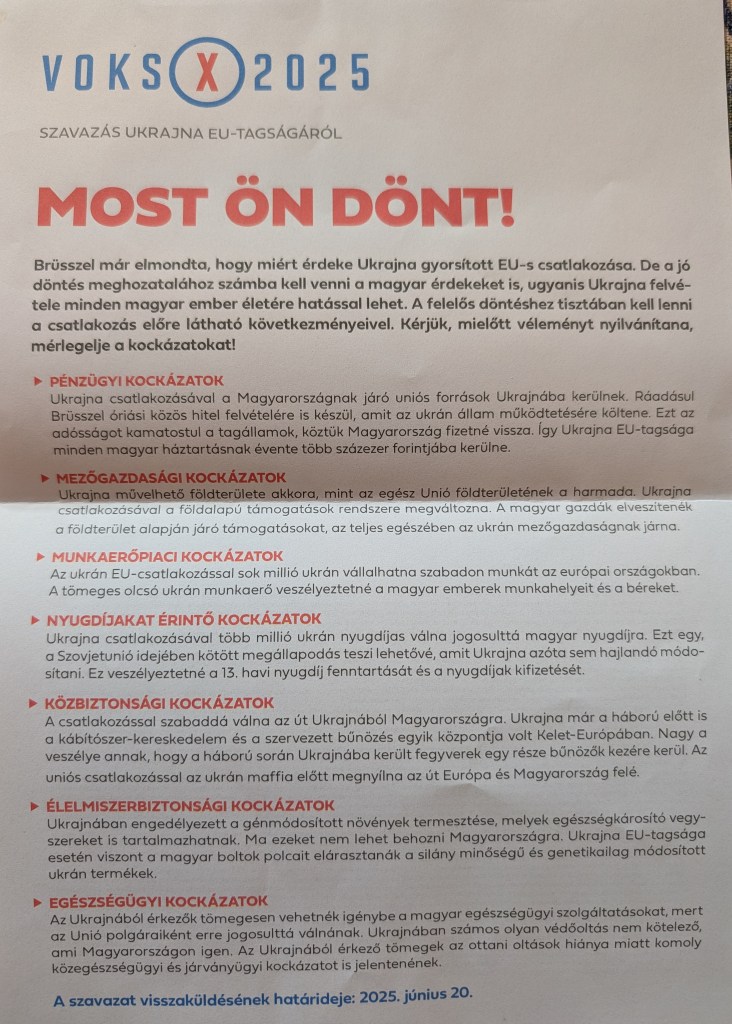 Choć nie jest to kolejna „konsultacja narodowa” a „głosowanie sondażowe” (véleményszavazás) to zdecyduje wpisuje się w klimat poprzednich „konsultacji”. Zamiast kwestionariusza mamy kartę do złudzenia przypominającą kartę do głosowania w oficjalnych wyborach czy też referndum. Podane są nawet przykłady prawidłowego zakreślenia pola (x lub +). Pytanie sformułowane jest w sposób neutralny: Czy popiera Pan/Pani członkostwo Ukrainy w Unii Europejskiej? (ciekawostka: identycznie jak w przypadku pytania partii Tisza), tradycyjne smaczki znajdziemy w liście premiera oraz towarzyszącym mu tekście.