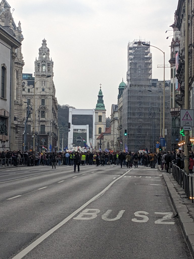 Tłum przed parlamentem nie był wielki, parę tysięcy osób. Kiedy podszedłem przemawiał akurat Ákos Hadházy, niezależny poseł znany ze swojej działalności demaskującej korupcję władzy. Mówił: „…, po drugie, powinniśmy nie bać się, a po trzecie, i to jest najtrudniejsze, zapraszam wszystkich, przejdźmy się do mostu Małgorzaty, to parę minut spacerem, i zablokujmy go na godzinę”.