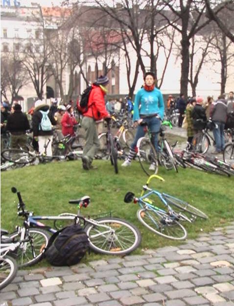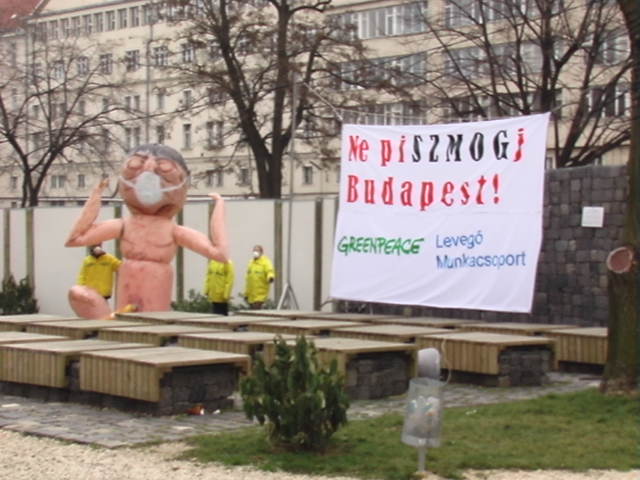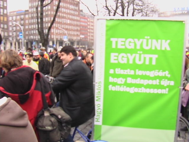Zadymiło ale tylko w przenośni, żadne tam zamieszki, tym bardziej, że chodziło o protest przeciwko zanieczyszczeniu powietrza w Budapeszcie. Dziś odbyła się w tej sprawie wspólna demonstracja Critical Mass z Greenpeacem oraz budapesztańską organizacją ekologiczną Levegő Munkacsoprt (Grupa Robocza „Powietrze”). Siły rowerzystów (dokładnie 620 według blogu Critical Mass) połączyły się z pieszymi na placu Városháza. Przybyła też masa przedstawicieli mediów.